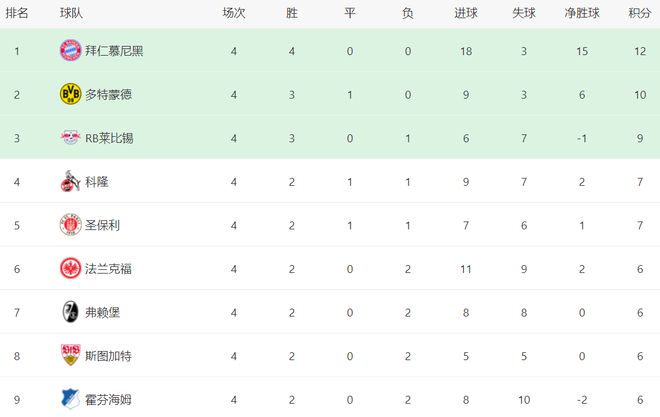 在积分榜上,4战全胜的拜仁以12分排名榜首。多特蒙德紧追拜仁,3胜1平拿到10分,排名第2。第3的是莱比锡,拿到了9分。科隆和圣保利都是7分,排名第4和第5名。法兰克福、弗赖堡、斯图加特、霍芬海姆和柏林联合都是6分。勒沃库森的战绩比较差,1胜2平1负,只拿到5分,排名第11。显然,勒沃库森本赛季很难威胁到拜仁的地位了。